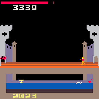You're inside the castle walls and fireballs are thrown at you: ⭕️ jump or ⬇️ duck to avoid them (or even take shelter walking back at the tower door). As you advance on the drawbridge a ladder will appear, in case you need an extra potion but beware the electric eel.