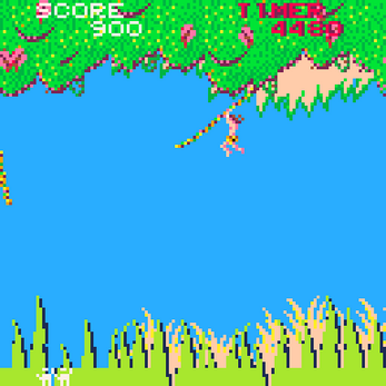 It is actually an easy stage when you find the right time to jump both and save the girl... but it will be probably cause troubles at first (in order to be prepared for this last stage, you might want to practice a little maybe? by selecting stage 4 in the main screen). At higher levels remember a third native will show up on the tree and throw his spear.