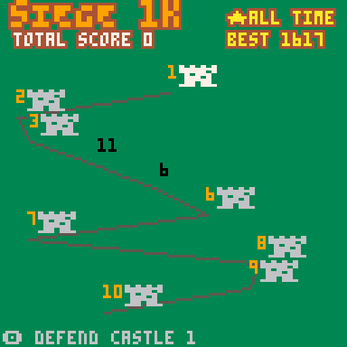 The original gameplay was so simple that 1K is enough to expand it with a main menu showing a total score across 10 castles (each with increased difficulty) and an all-time best score. Unlike a typical 1k jam game, Siege 1K saves the progress and scores.